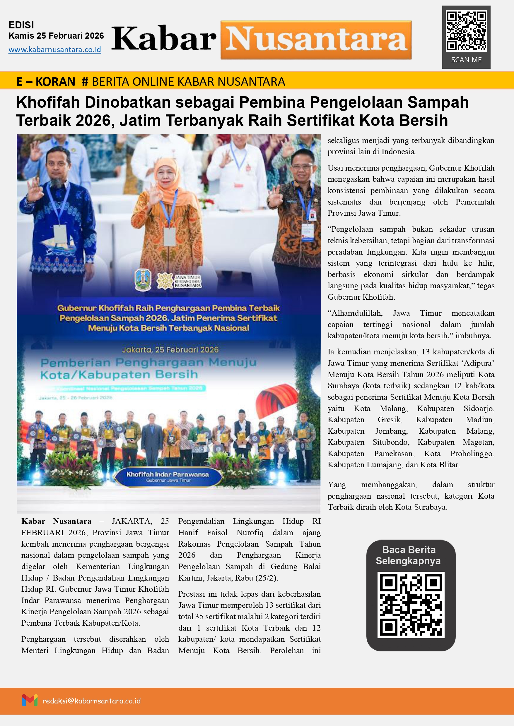 Khofifah Dinobatkan sebagai Pembina Pengelolaan Sampah Terbaik 2026, Jatim Terbanyak Raih Sertifikat Kota Bersih